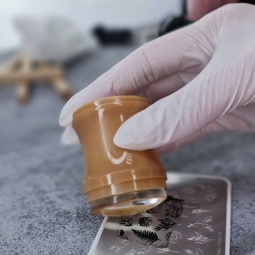 5. Passer la carte à racler à un angle de 45 degrés (à angle droit) pour retirer l'excès de vernis en un seul mouvement 6. Appliquer le tampon sur le motif rapidement et sans pression, dans un mouvement de bascule pour imprimer le motif sur le tampon (1-2 sec). Attention ! Une pression excessive sur le tampon est l'erreur la plus courante lorsque l'on travaille avec un tampon transparent !
