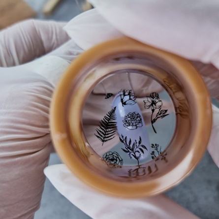 Important ! Pour que le tampon dure plus longtemps et ne devienne pas trouble, ne le nettoyez pas avec de l’acétone ou des liquides ! Nettoyez le tampon uniquement avec un rouleau de stamping adhésif (ou un rouleau adhésif pour nettoyer les vêtements).
