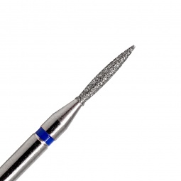 Fraise en diamant forme flamme. Embout pointu. Grain bleu (moyen) parfait pour l'ongle avec beaucoup de cuticules. Diamètre : 0,14 cm. S'utilise pour la préparation de la plaque de l'ongle, pour éliminer et nettoyer les cuticules et pour le repli latéral. Cette fraise permet d'optimiser l'adhésion du gel à l'ongle naturel et d'éviter les décollements.