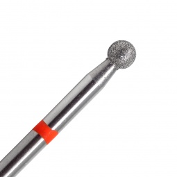 Fraise en diamant forme boule. Grain rouge (Doux). Diamètre : 0,31 cm. S'utilise pour la coupe des cuticules sans pince à envies en technique de manucure russe.