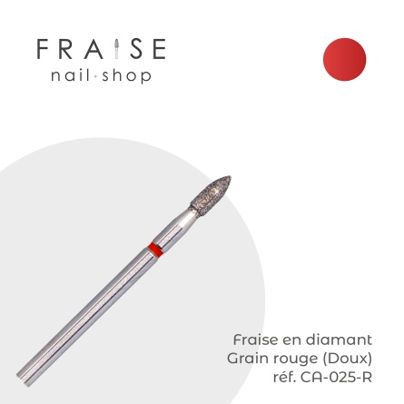 Fraise en diamant forme cartouche. Grain rouge (Doux). Diamètre : 0,25 cm. S'utilise pour la préparation de la plaque de l'ongle et pour éliminer et nettoyer les cuticules ainsi que le repli latéral. Cette fraise permet d'optimiser l'adhésion du gel à l'ongle naturel et d'éviter les décollements. Embout arrondi.