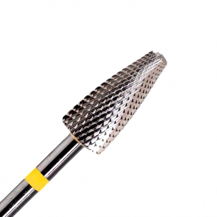 Fraise en carbure grain jaune (très doux). Embout arrondi sécurisé. Ne chauffe pas pendant la dépose et le ponçage. Cet embout permet de retirer le semi-permanent et d'affiner la forme de la construction. Diamètre : 0,6 cm. Longueur tête : 1,4 cm.