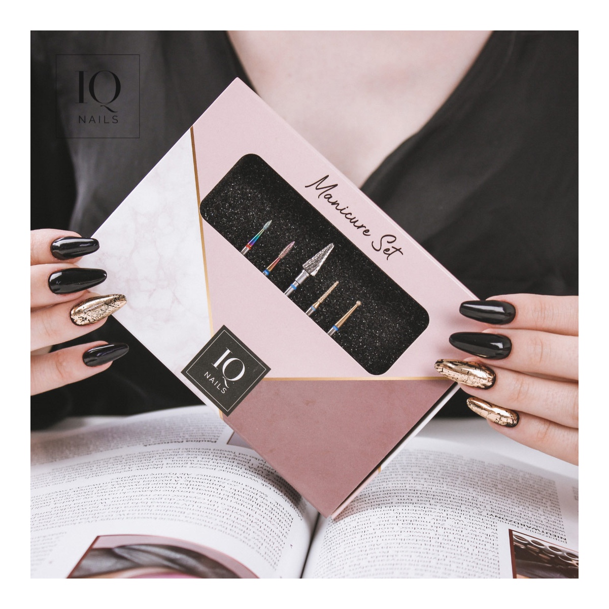Set manucure "Expert I" comprenant 5 fraises de la marque IQ Nails : une fraise en carbure pour la dépose du semi-permanent, du gel et de la résine ainsi que quatre fraises en diamant pour les cuticules dont deux avec une couche de revêtement NANO caméléon, et deux autres avec une couche de revêtement dorée NANO en zirconium. Ces embouts peuvent être stérilisés dans un autoclave. Composition du kit :