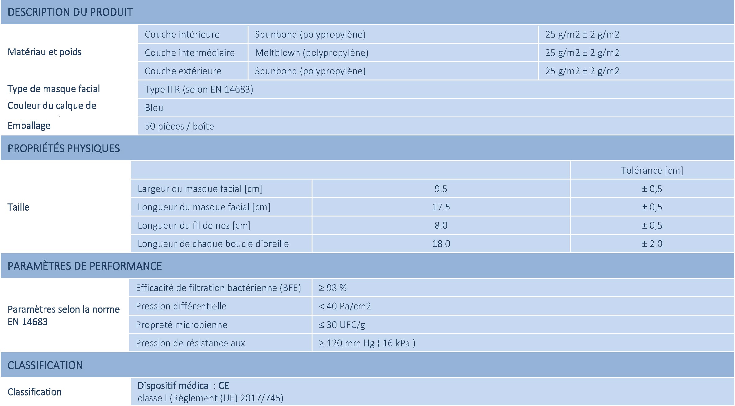 Boite de 50 masques chirurgicaux jetables de type IIR. Marque MERCATOR. Dispositif médical couvrant la bouche et le nez, offrant une barrière pour minimiser la transmission directe d'agents infectieux entre le personnel et le patient / client. Masques médicaux à 3 plis et 3 couches, avec boucles d'oreilles, en non-tissé. Grace aux attaches flexibles, le masque s'adapte correctement au visage de l’utilisateur. Produit non stérile, à usage unique.