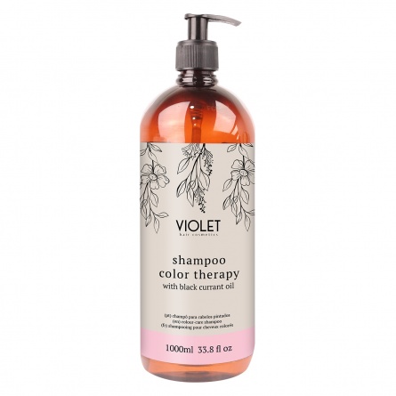Shampoing protecteur de couleur COLOR THERAPY pour cheveux colorés, à base d’huiles de cassis noir, de pépins de raisin et d’amande douce. Spécifiquement formulé pour régénérer, hydrater, prolonger l’éclat de la couleur et des mèches ainsi que prévenir la casse des cheveux. Marque Violet. 1000 ml. Cruelty free et Vegan. Formulé sans SLS, SLES, SILICONES, MINERAL OIL, et Colorants artificiels.