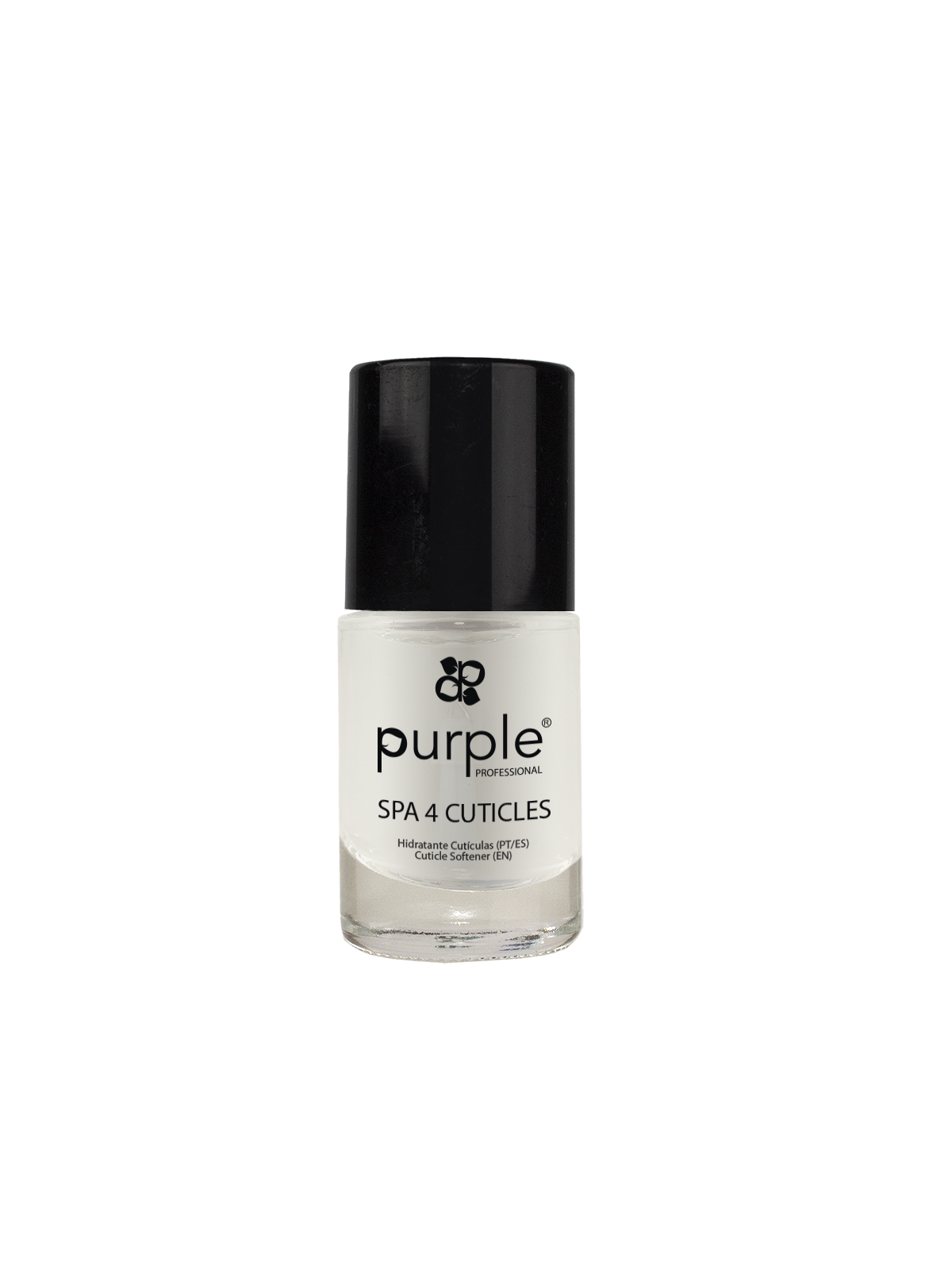 Émollient pour cuticules de la gamme Purple Spa. Flacon de 10 ml. Ce produit ramollit les cuticules et facilite leur retrait ultérieur en douceur. Sa texture liquide permet une application simple et précise.