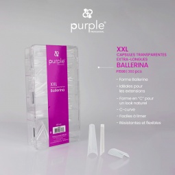 Boite de 360 capsules XXL BALLERINA de Purple. Ces capsules extra-longues de forme ballerine sont idéales pour les extensions. Elles sont faciles à limer, résistantes et flexibles. Le C-curve de ces capsules offre un look naturel. Elles sont de couleur transparente et numérotées de 0 à 11. 12 tailles différentes.