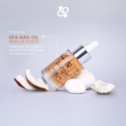 Huile pour les ongles et les cuticules parfumée à la Noix de coco de la gamme Purple Spa. Flacon de 30 ml avec pipette.