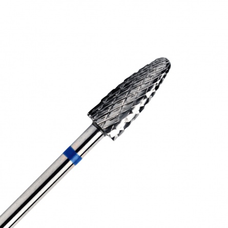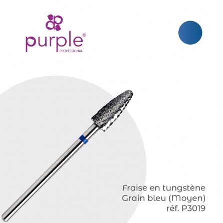 Fraise en carbure de tungstène grain bleu (Moyen). Embout arrondi sécurisé. Marque Purple. Idéale pour la dépose du gel, de la résine et de l'acrygel, ainsi que pour affiner la forme de la construction. Diamètre : 5 mm et longueur tête : 13 mm.